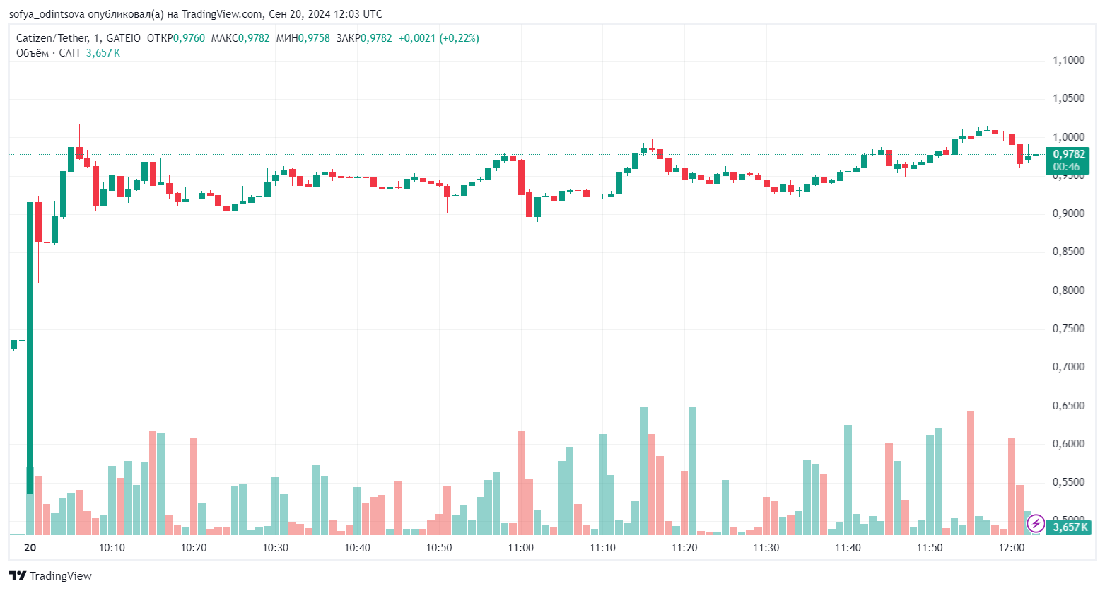 По данным TradingView, на момент написания материала CATI торгуется по $0,9782. Токен Catizen дебютировал с отметки около $0,8.