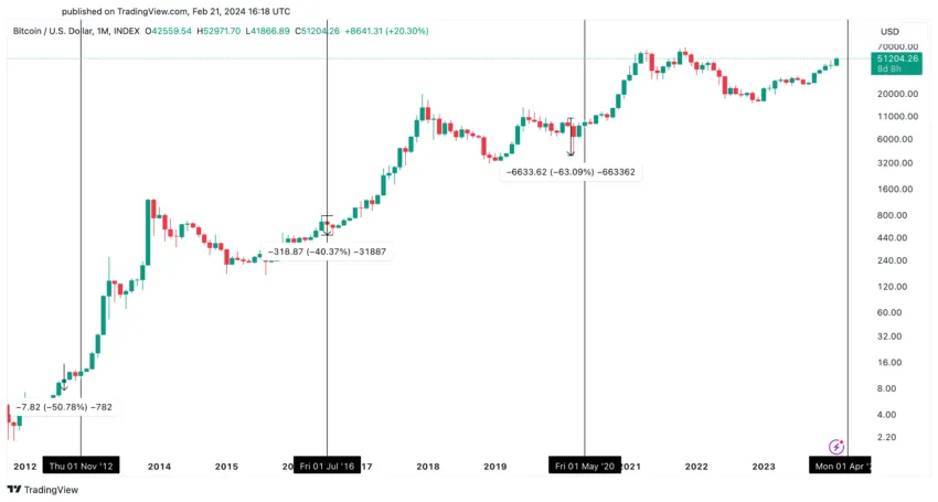 После халвингов в 2012, 2016 и 2020 годах биткоин продемонстрировал ошеломляющий рост на 11 000%, 3 072% и 700% соответственно. Ралли длились от 365 до 549 дней.