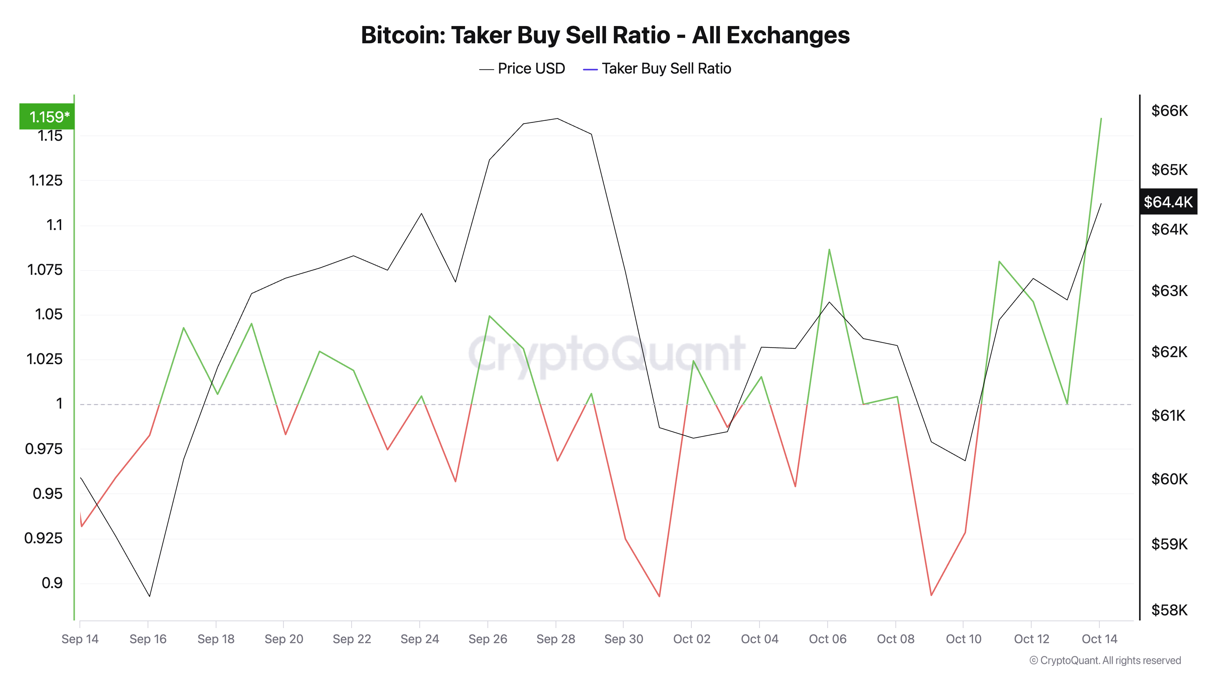 Индикатор Taker Buy Sell Ratio достиг максимального значения за последний месяц и сейчас составляет 1,19. Метрика показывает соотношение объема покупок и продаж актива, совершаемых участниками рынка, которые открывают рыночные ордера («тейкеры»).