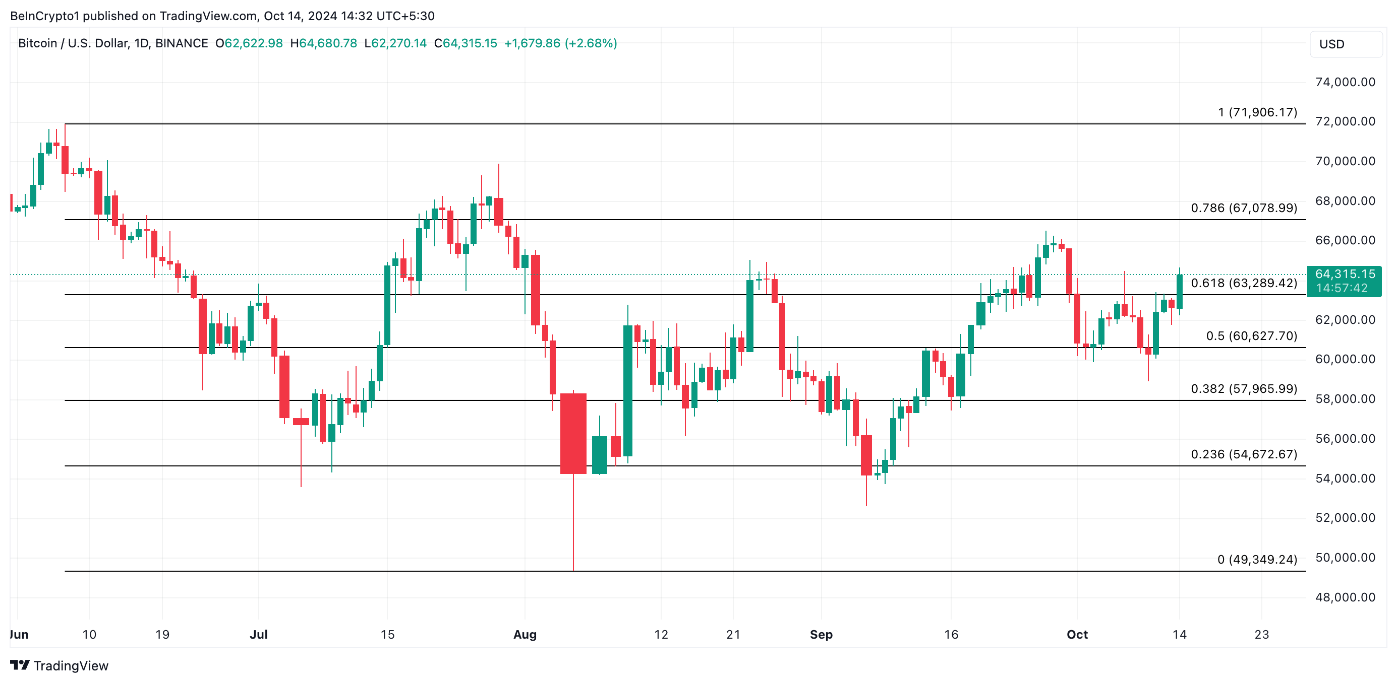 Сейчас биткоин торгуется чуть выше критического уровня сопротивления $63 289. Если текущий восходящий тренд сохранится, цена может провести успешный ретест этой отметки, что позволит ей продолжить рост до $67 078.