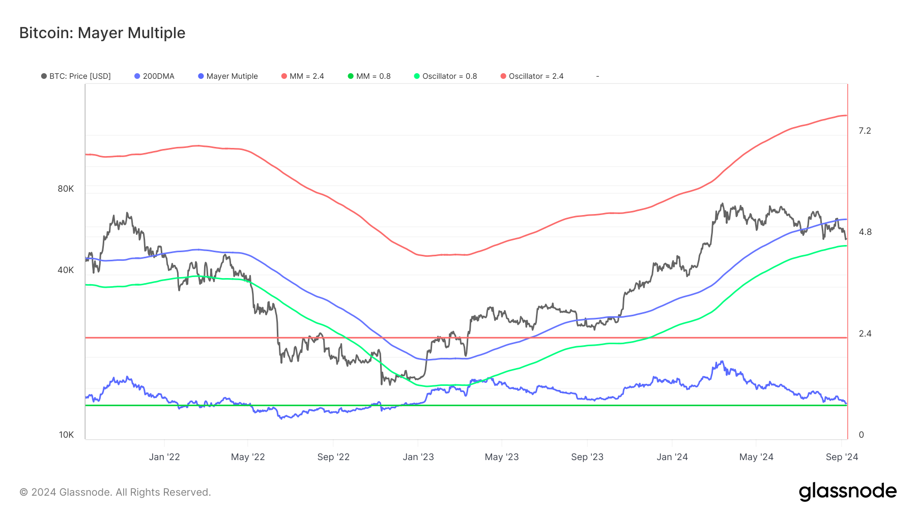 Согласно данным аналитической платформы Glassnode, множитель Майера, который часто используют для выявления спекулятивных пузырей, сейчас находится на отметке 0,8. Цена биткоина при этом движется ниже 200-дневной EMA, что может привести к дальнейшему падению.