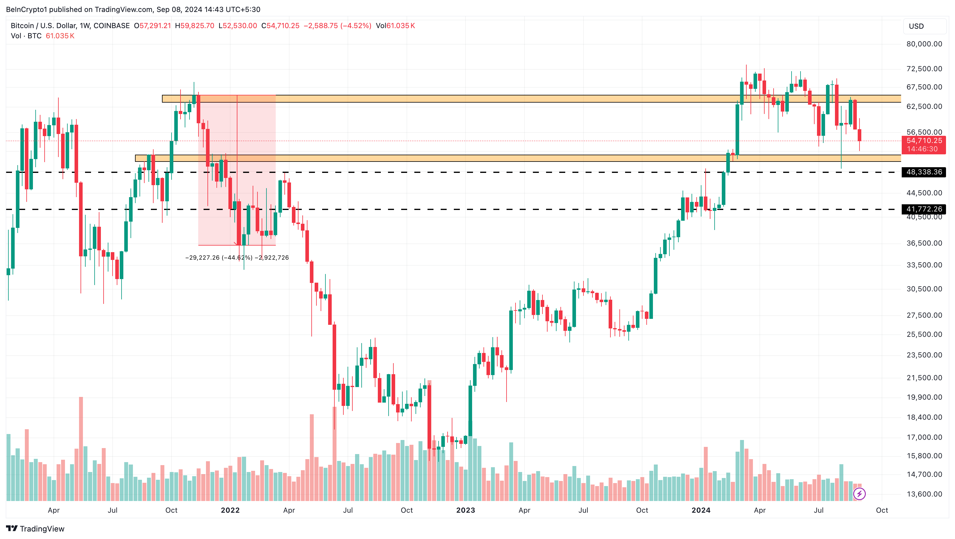 На недельном графике BTC/USD видно, что трейдеры вступили в этот месяц с ценами, схожими с ноябрем 2021 года, непосредственно перед началом медвежьего рынка. Ключевая поддержка находится в районе $50 000, и биткоин, вероятно, вновь протестирует этот уровень. Если он не устоит, цена BTC может снизиться до $48 338, с возможностью дальнейшего падения до $45 000.