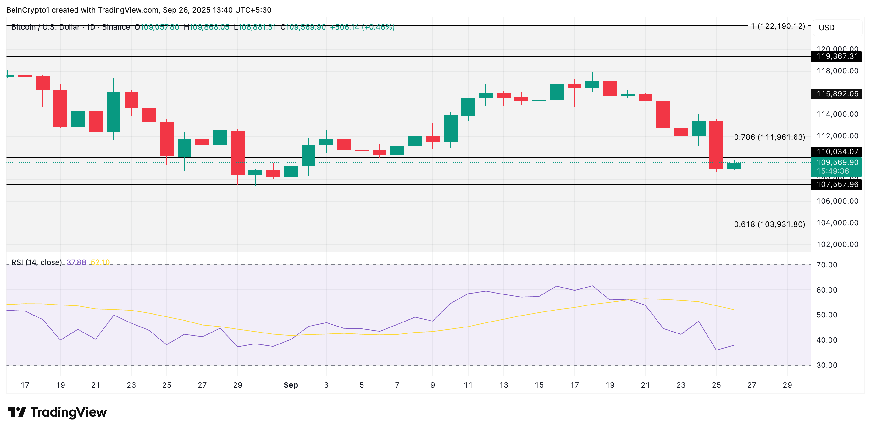 Это означает, что криптовалюта постепенно входит в зону перепроданности. В рамках медвежьего сценария BTC рискует продолжить снижение до $107 557. Если поддержка не удержится, биткоин упадет до $103 931.
