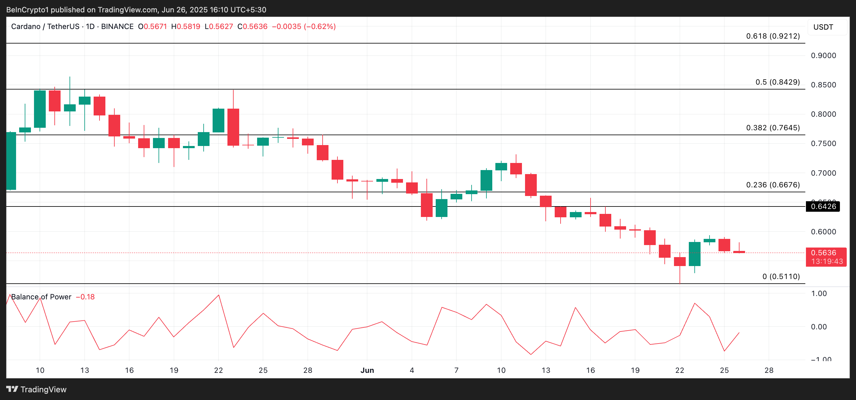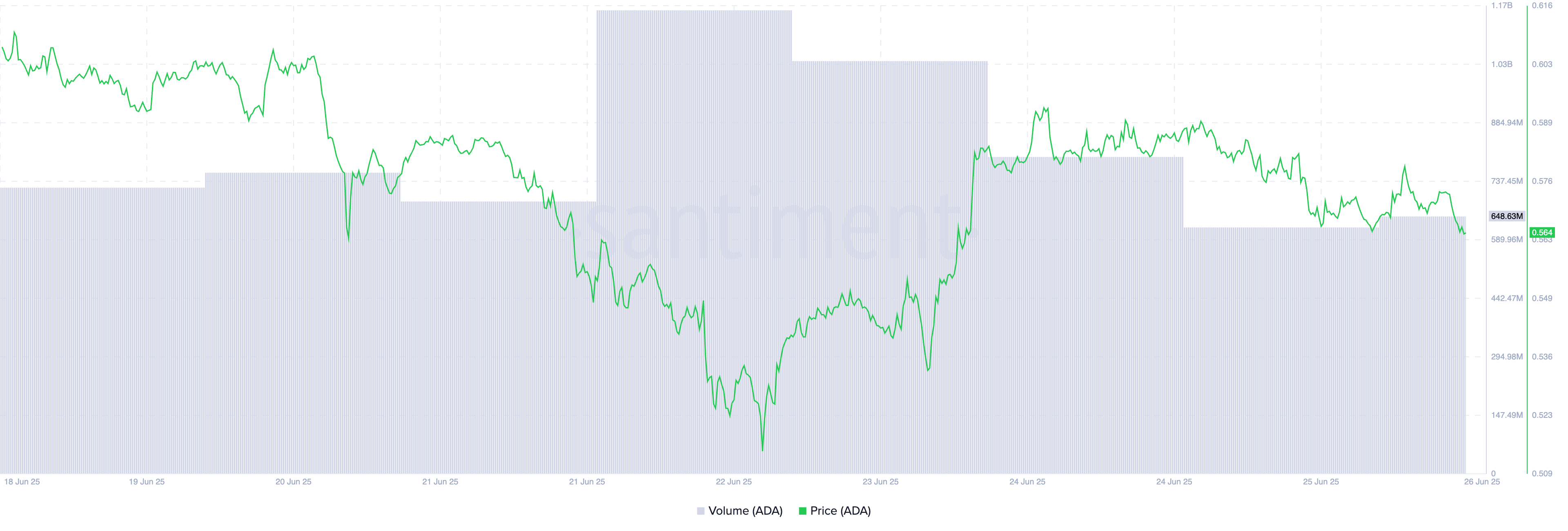 Однако на этом фоне интерес рынка к ADA не вырос. На момент написания этого анализа токен торгуется по $0,564, снизившись на 3% за сутки. Суточный объем торгов за этот период вырос почти на 10%, что указывает на усиление давления продаж. На момент публикации показатель составляет $649 млн.