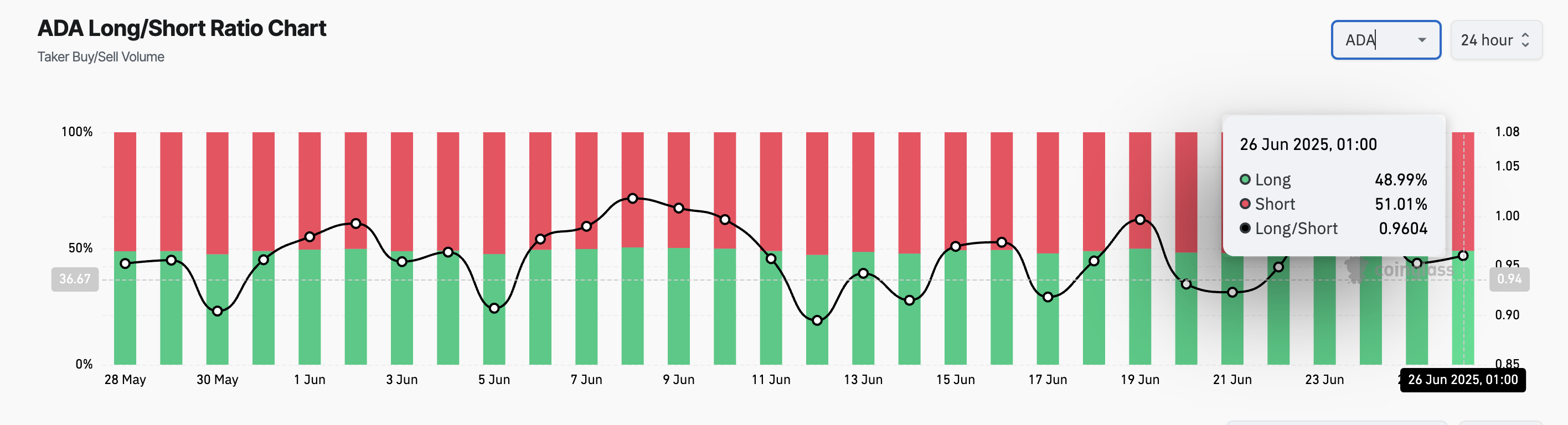 На фьючерсном рынке ADA заметно увеличилось количество коротких позиций. На момент публикации соотношение длинных и коротких позиций составляет 0,96. Это означает, что большинство трейдеров ожидает дальнейшего снижения цены Cardano.