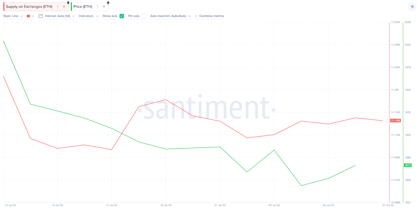 Согласно данным Santiment, 17 июля объем биржевого предложения Ethereum упал до 5-летнего минимума в 11,07 млн монет. По мере его сокращения и снижения торговой активности цена ETH оставалась в пределах $1850–1890.