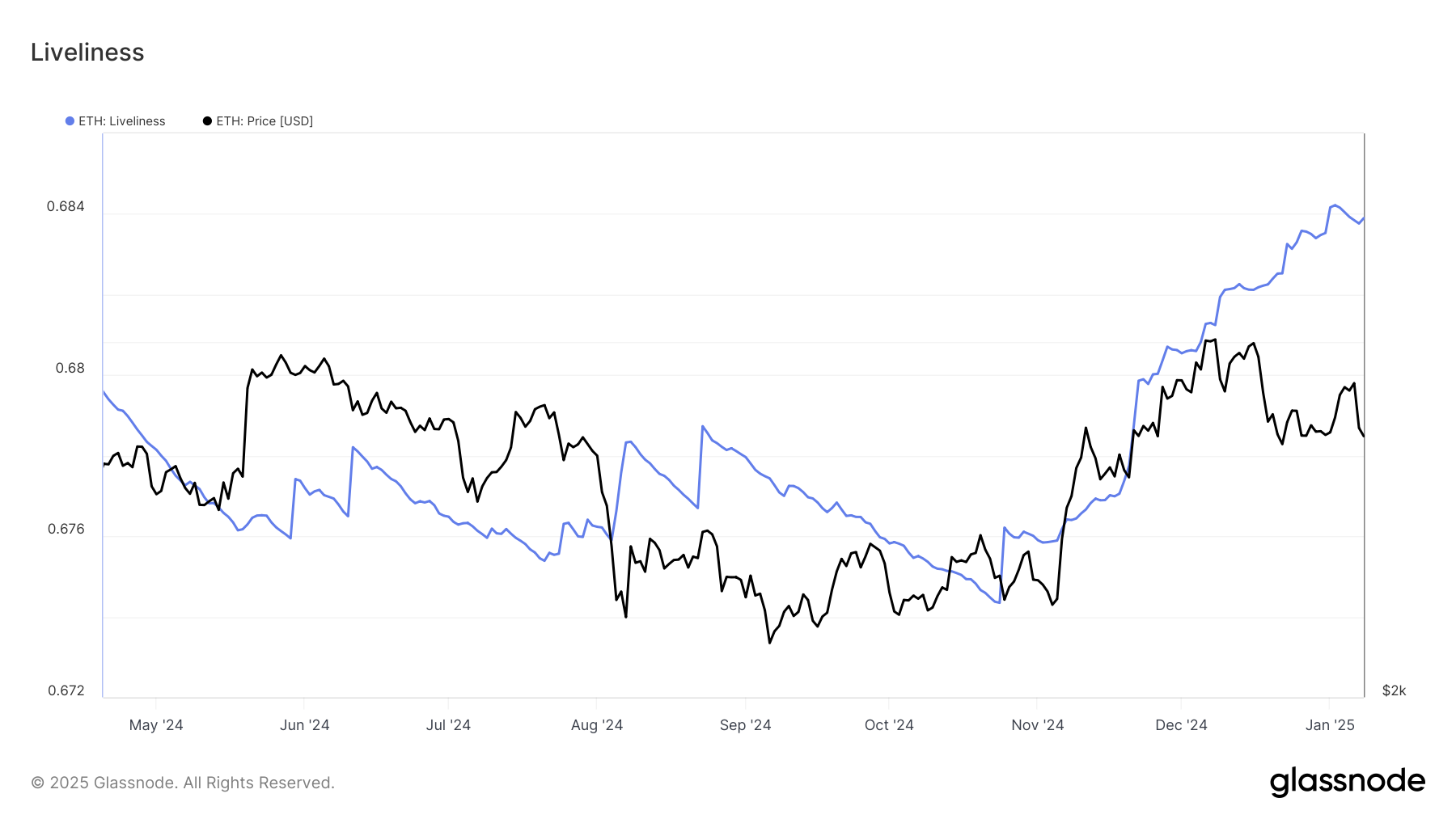 Индикатор Liveliness помогает отслеживать активные продажи среди держателей Ethereum. Так, некоторые инвесторы избавляются от актива — вероятно, они опасаются затяжной консолидации или дальнейших коррекций. Столь высокое давление продаж подчеркивает тот факт, что уверенности на рынке альткоина сейчас недостаточно.