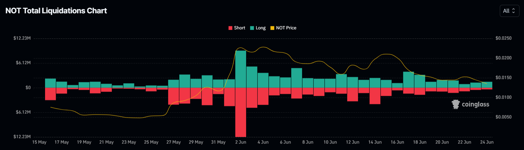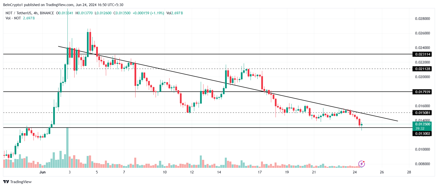 В середине июня Notcoin (NOT) пытался прорваться выше линии нисходящего тренда, но так и не смог закрепить ее в качестве поддержки.