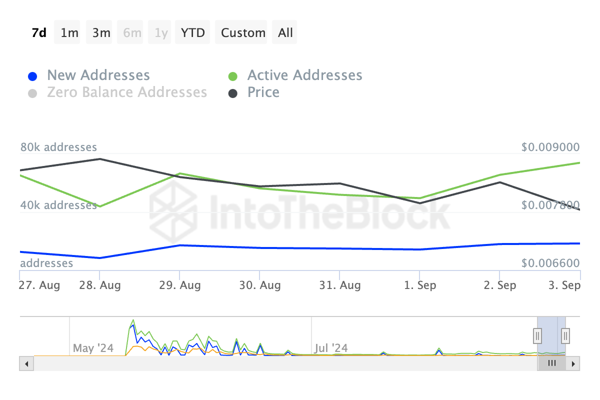 По данным IntoTheBlock, за семь дней количество ежедневных активных адресов альткоина увеличилось на 13%. Кроме того, резко возрос спрос на NOT со стороны новых пользователей: показатель подскочил на 46%.