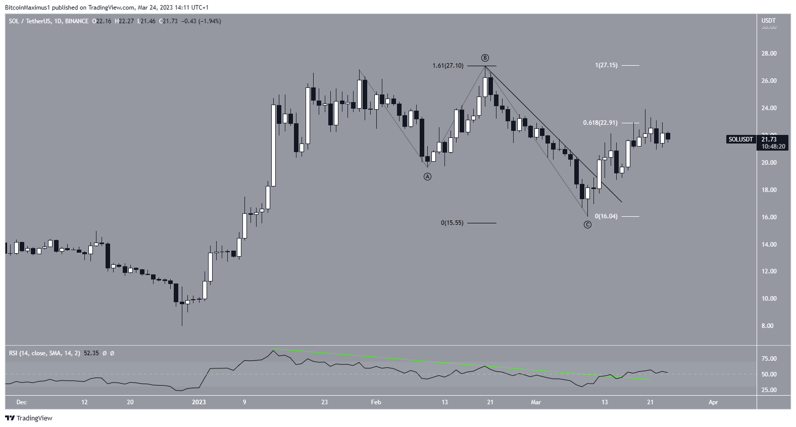 Технический анализ дневного таймфрейма дает позитивный прогноз. Во-первых, SOL отбилась от нисходящей линии сопротивления, достигнув 20 марта нового годового максимума в $23,91, хоть и не смогла закрыться выше уровня 0,618 Фибоначчи на отметке $22,91 (на графике он отмечен белым цветом).