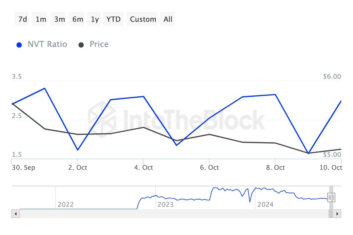 В случае с Toncoin значение NVT за последние 24 часа увеличилось на 82%. Рост рыночной капитализации по сравнению с объемом транзакций свидетельствует о том, что альткоин может быть переоценен. В результате цена может скорее столкнуться с потенциальным снижением, чем с продолжением восходящего тренда.
