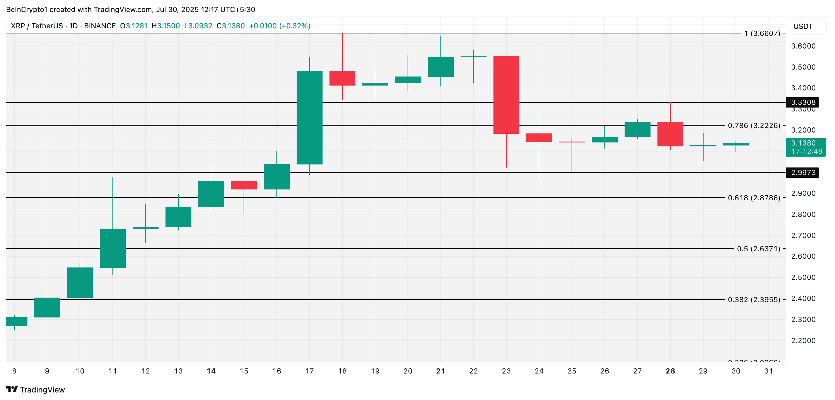 На момент написания XRP торгуется по $3,13, находясь ниже уровня сопротивления $3,22. Если распродажи усилятся и токен выйдет из боковика, его цена может упасть до $2,99.