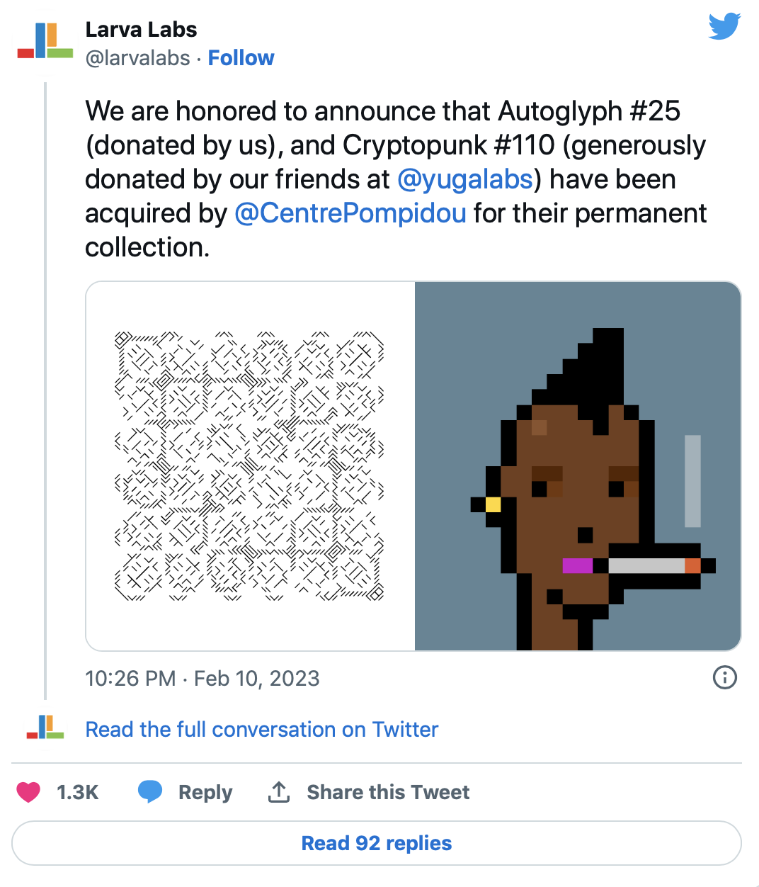 Yuga Labs передала Центру Помпиду CryptoPunk #110 в рамках проекта Punks Legacy Project. Инициатива, направленная на размещение NFT в известных музеях по всему миру, началась с «криптопанка» #305. Институт современного искусства Майами заполучил его в ноябре прошлого года.