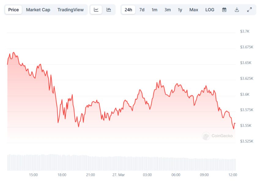 По данным CoinGecko, за последние сутки курс второй криптовалюты снизился на 3%. На момент написания материала ETH торгуется на отметке в $3 550.