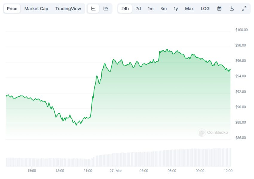 Litecoin тем временем подорожал за прошедшие 24 часа на 3,6%, а объем торгов альткоином подлетел более чем на 100%. В настоящее время цена LTC составляет $94,99.