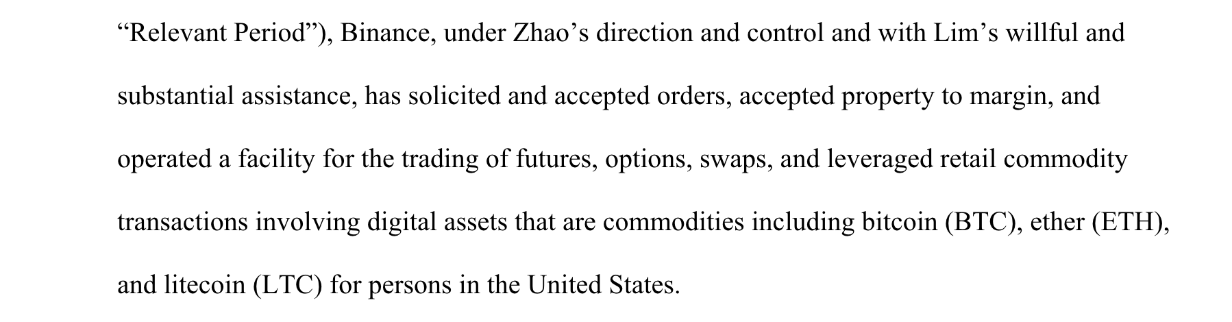 Крупнейшая в мире криптовалютная биржа Binance Holdings Ltd. и ее генеральный директор Чанпэн Чжао (CZ) получили иск от Комиссии по торговле товарными фьючерсами США (CFTC) за предполагаемое нарушение правил торговли деривативами. Регулятор заявляет, что Binance уклонилась от своих обязательств, не зарегистрировавшись должным образом, а некоторые активы, которые торгуются на платформе – биткоин (BTC), Ethereum (ETH) и Litecoin (LTC) попадают под категорию товаров.