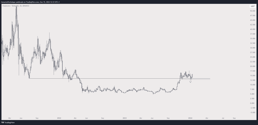 Дневной таймфрейм показывает, что цена LINK росла с 3 января, когда она упала до минимума $12,24. 8 января она сформировала повышающийся минимум, что привело к появлению свечи бычьего поглощения. С тех пор токен растет ускоренными темпами.