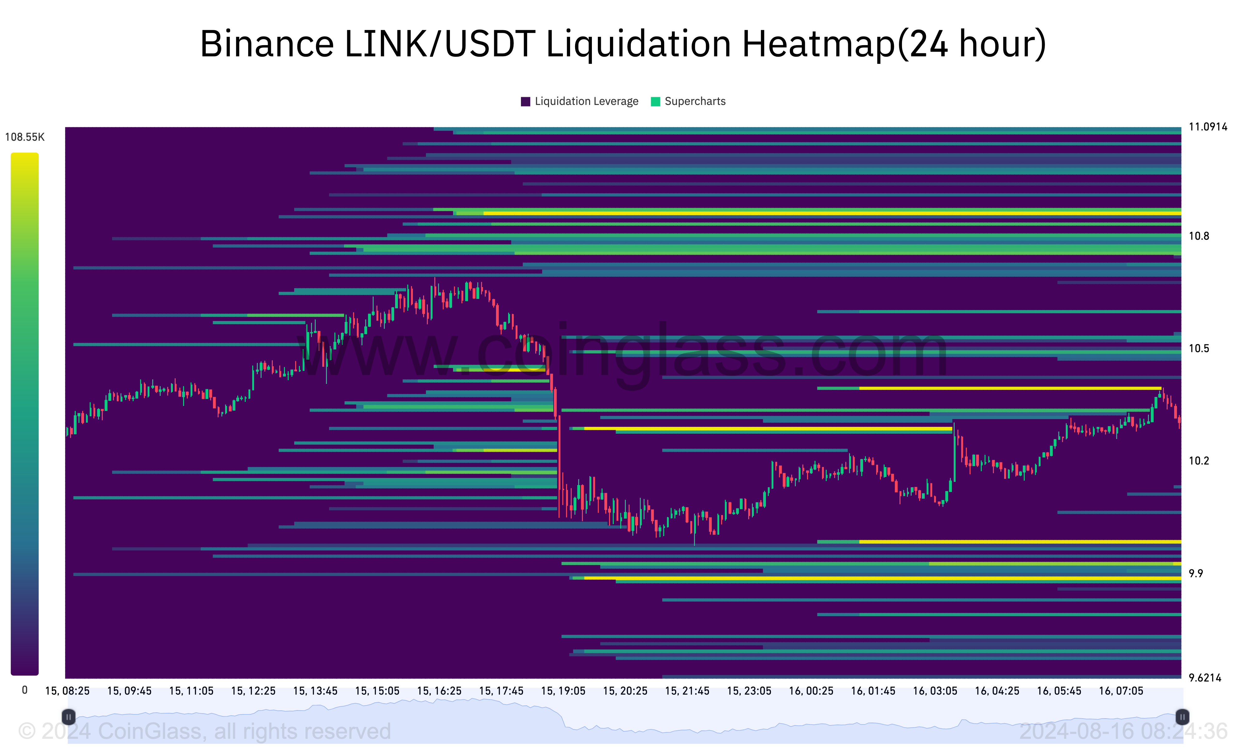 На 24-часовой карте LINK видны области сильной концентрации ликвидности около $9,88 и $9,97. Если давление на продажу усилится, цена может упасть к этим уровням.