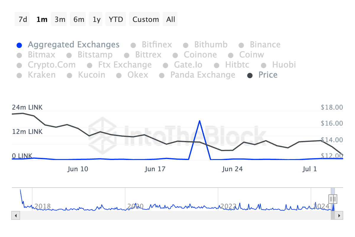 На фоне роста активности крупных игроков цена LINK упала на 37%. Это означает, что киты постепенно продавали свои активы. Рост поступлений токенов Chainlink на биржи подтверждает это предположение.