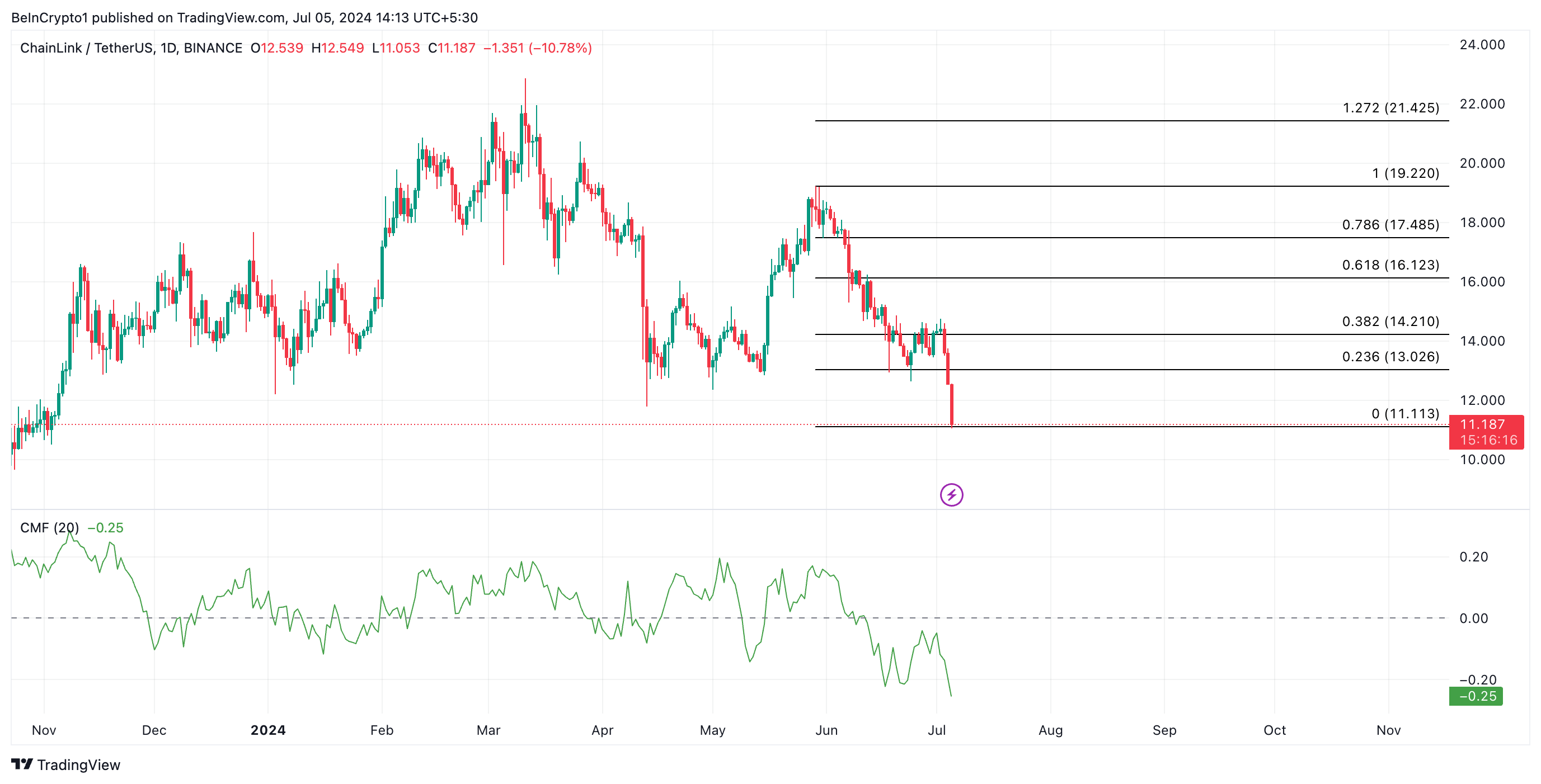 Если тренд сохранится, Chainlink может упасть до $11,11, обновив зафиксированный в ноябре 2023 года минимум.