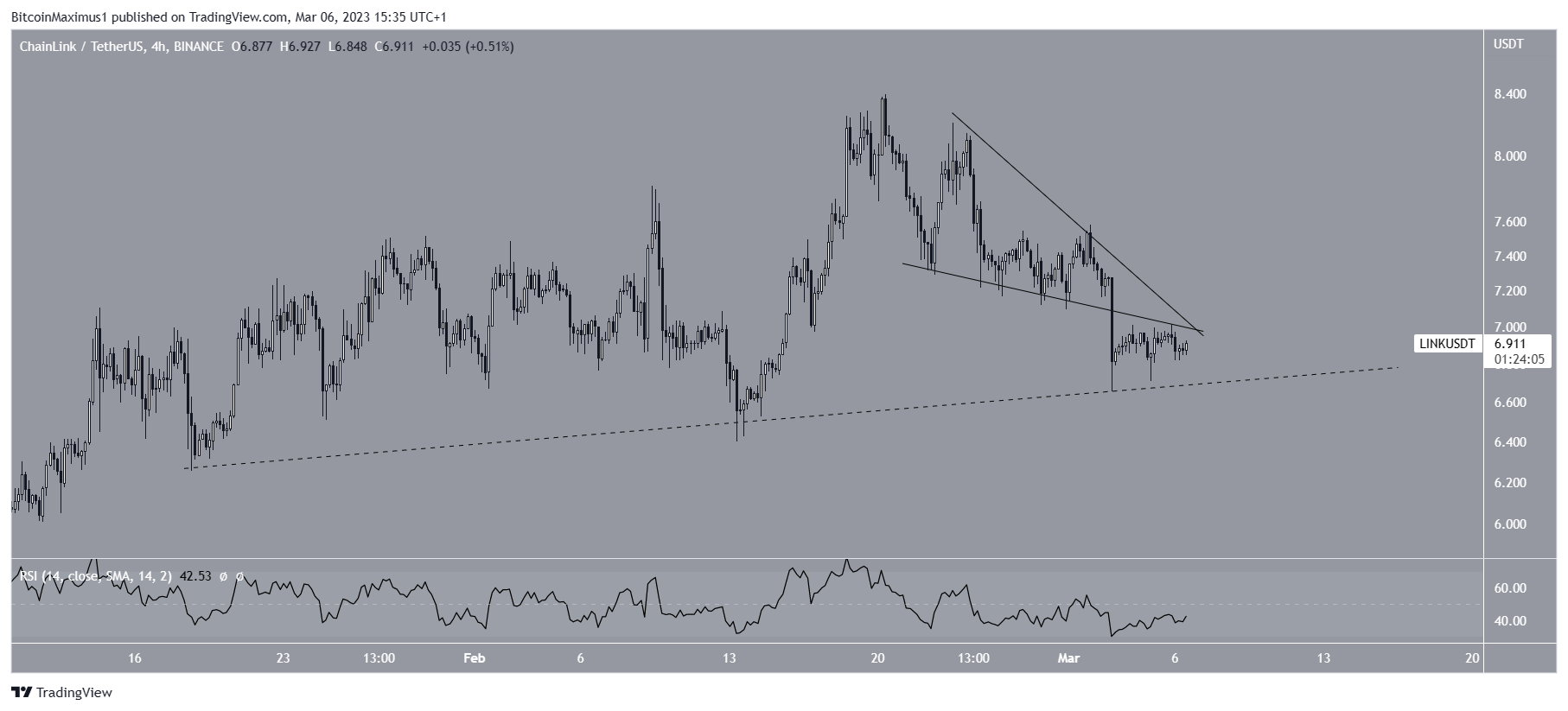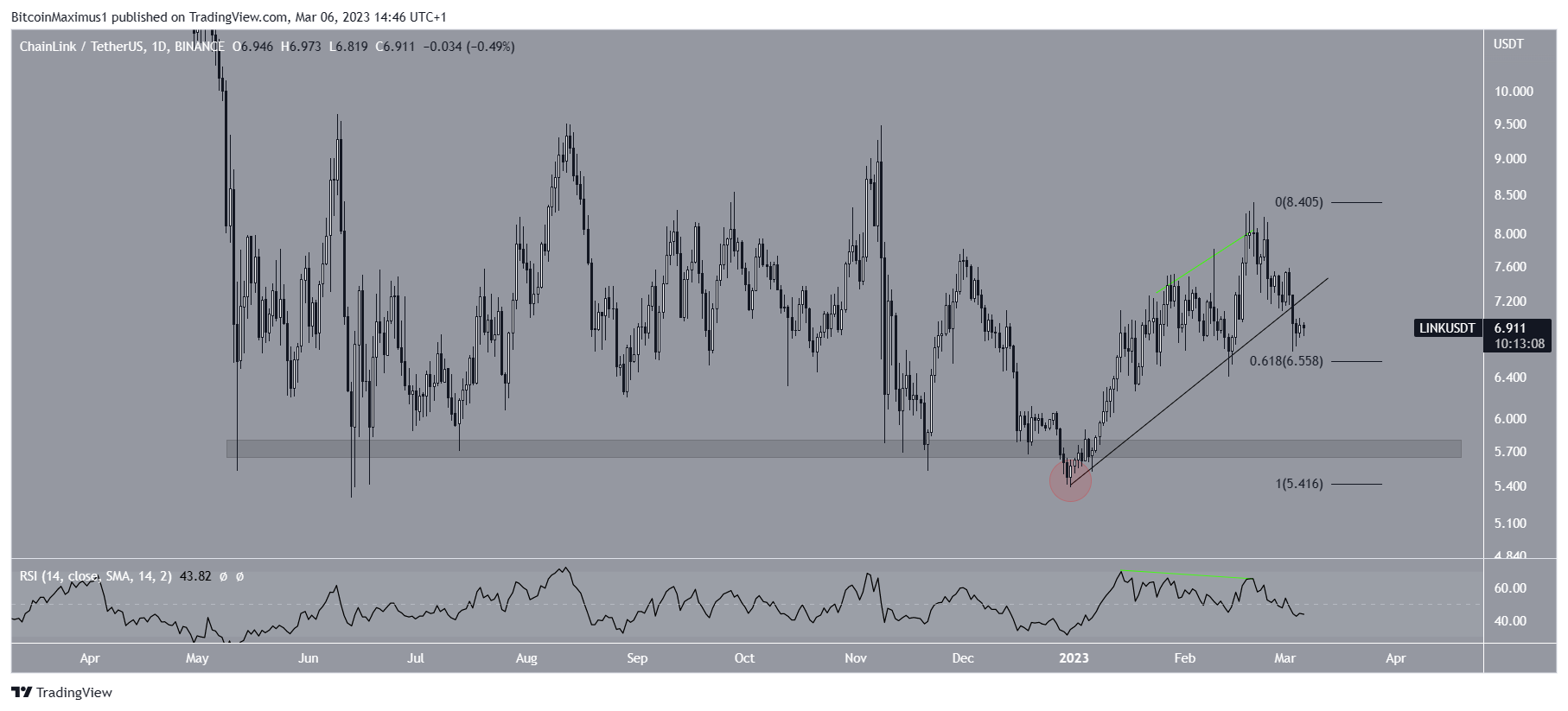 Цена Chainlink росла вдоль восходящей линии поддержки с тех пор, как она отклонилась ниже горизонтального уровня поддержки $5,75 (на графике он отмечен красным кругом) в начале года. 20 февраля она достигла локального максимума на отметке $8,40, однако вскоре после этого развернулась и с тех пор падает.