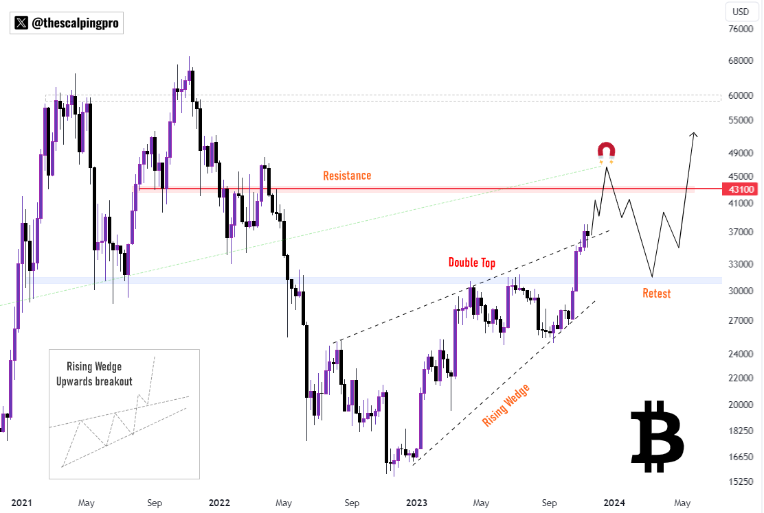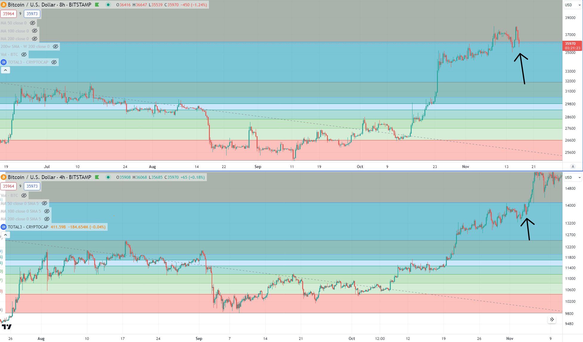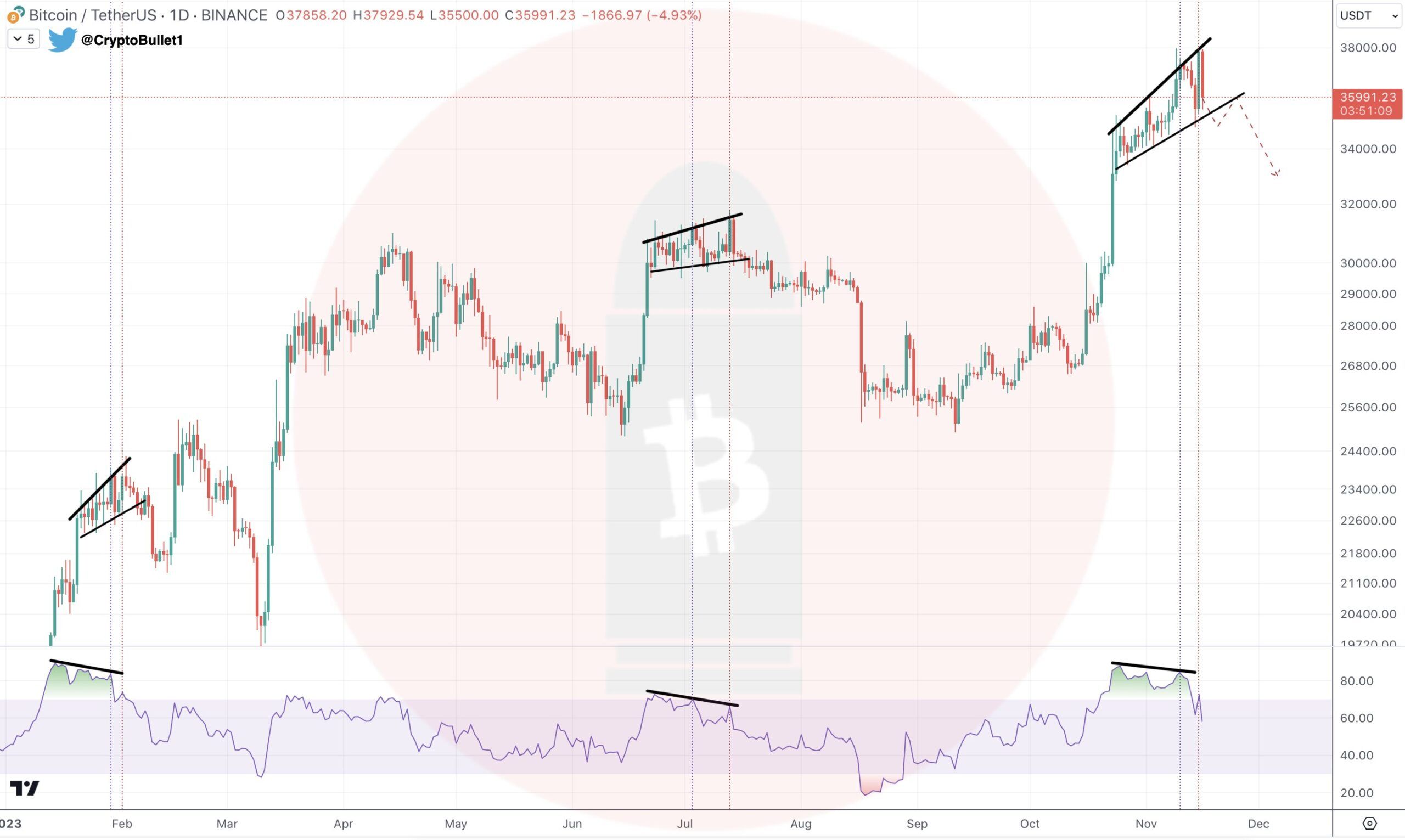 Впрочем, не все разделяют позитивный прогноз биткоина. Например, трейдер и аналитик CryptoBullet видит сигналы, которые могут указывать на то, что BTC исчерпал потенциал роста. По его мнению, биткоин ждет краткосрочная коррекция к уровням ниже $34 тыс.