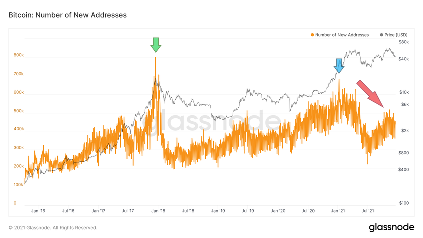 Последний пик был достигнут в начале января 2021 года (синяя стрелка) после того, как биткоин завершил фазу роста с $10 000 до $42 000. На тот момент этот уровень был историческим максимумом. С тех пор цена обновила рекорды, однако на графике новых адресов (красная стрелка) идет коррекция.