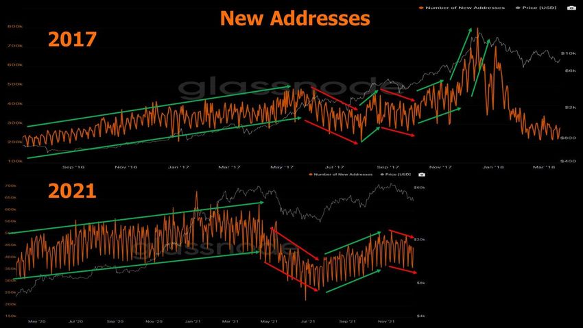 Аналитик криптовалютного рынка @OnChainCollege обнаружил на этом графике интересную закономерность. Он сравнил фракталы новых адресов в 201 и 2021 годах. График показывает, что количество новых адресов меньше, чем во время циклического пика.
