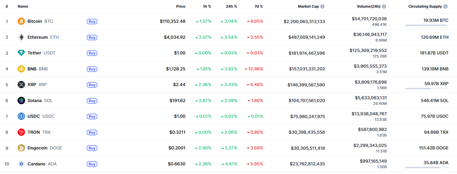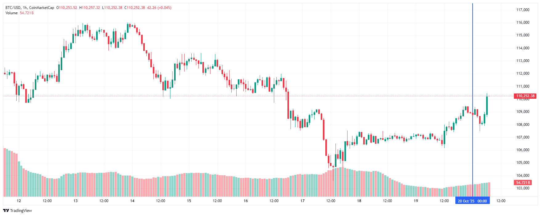 Биткоин (BTC), по данным ресурса TradingView, начал понедельник с роста. По состоянию на 07:11 (МСК), криптовалюта торгуется по $110 252 (1 токен в рублях — ₽8 974 895). Минимум биткоина за 24 часа — $106 157, максимум — $110 476.