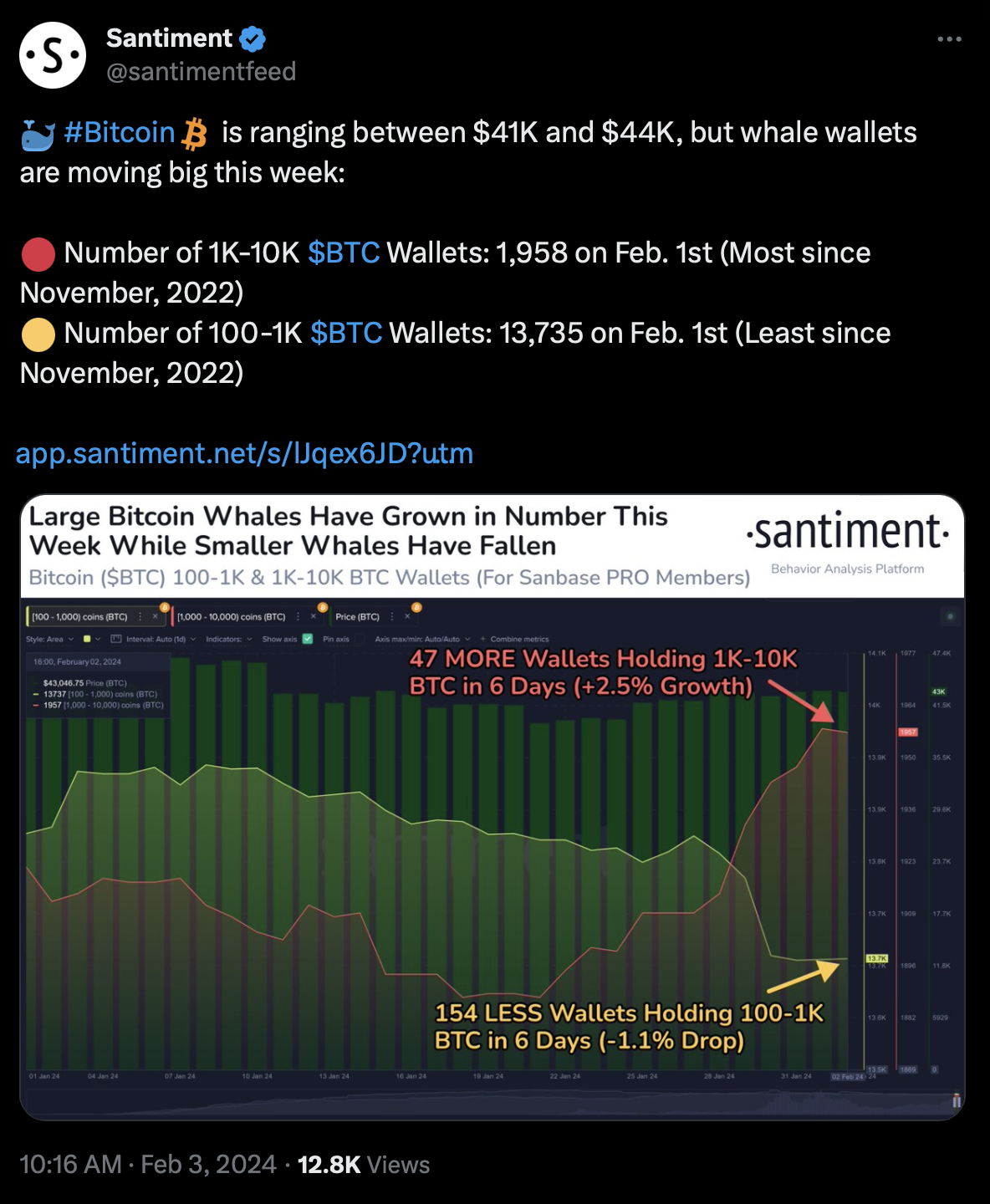 Число кошельков, в которых хранится от 1 000 до 10 000 BTC, на 1 февраля составляло 1 958, что стало самым высоким показателем с ноября 2022 года. Количество адресов с балансом от 100 до 1 000 BTC, тем временем, снизилось до минимального за тот же период значения в 13 735.