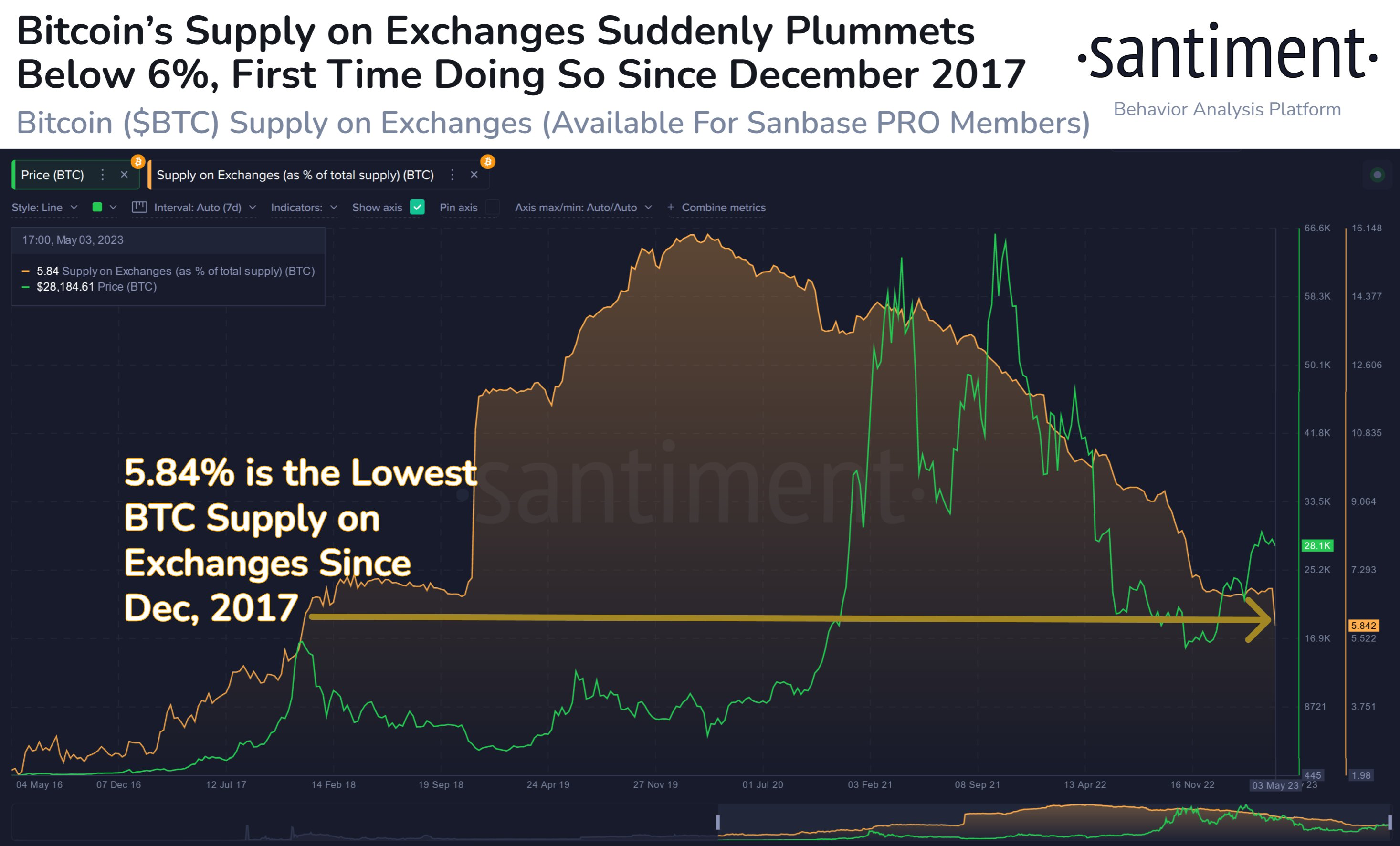 Совокупный баланс биткоина на биржах упал до пятилетнего минимума