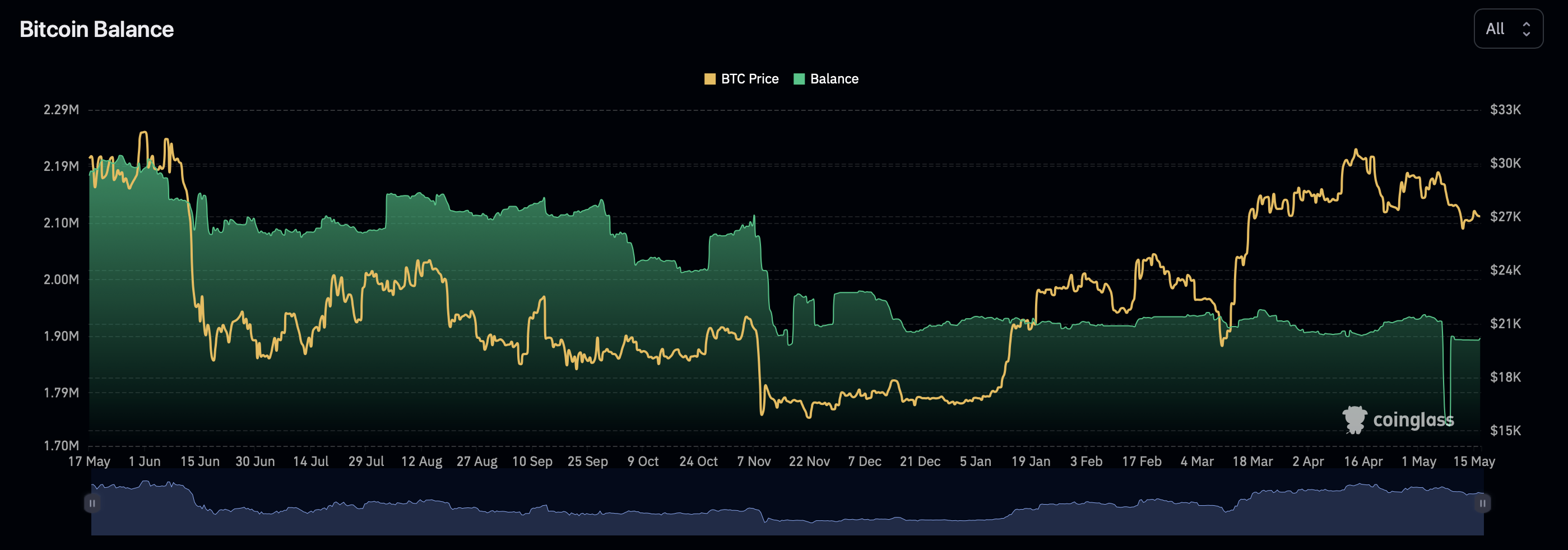 Согласно данным Coinglass, по состоянию на 9 мая 2023 года совокупный баланс биткоина на ведущих биржах составил 1,74 млн BTC. За месяц он сократился почти на 15%.