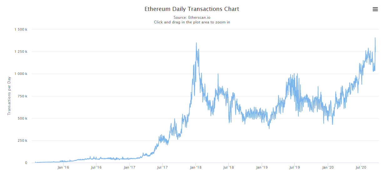 Скачок в сети Ethereum обусловлен DeFi-манией, которая спровоцировала ажиотаж на рынке. Согласно графику ежедневных транзакций Ethereum, рекордный максимум был достигнут 17 сентября, когда было зарегистрировано 1406016 транзакций. В последний раз Ethereum приблизился к такому уровню в январе 2018 года на пике ICO.