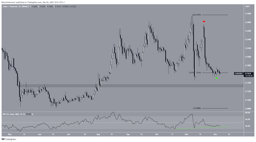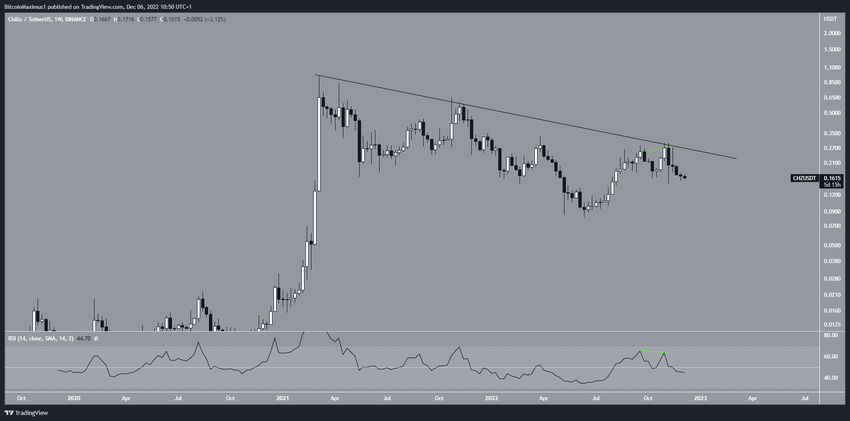 Таким образом, согласно недельному таймфрейму, курс Chiliz может упасть к $0.13. Этот долгосрочный медвежий прогноз сможет отменить лишь бычий пробой линии нисходящего сопротивления.