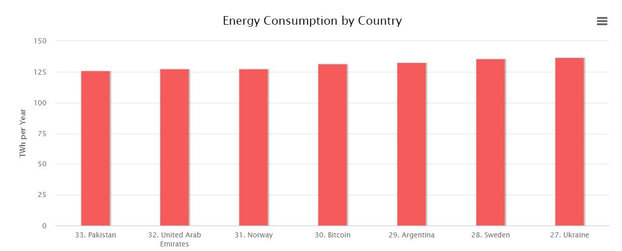 По состоянию на момент написания материала, по потреблению электроэнергии в год биткоин можно сравнить с Норвегией и Аргентиной.