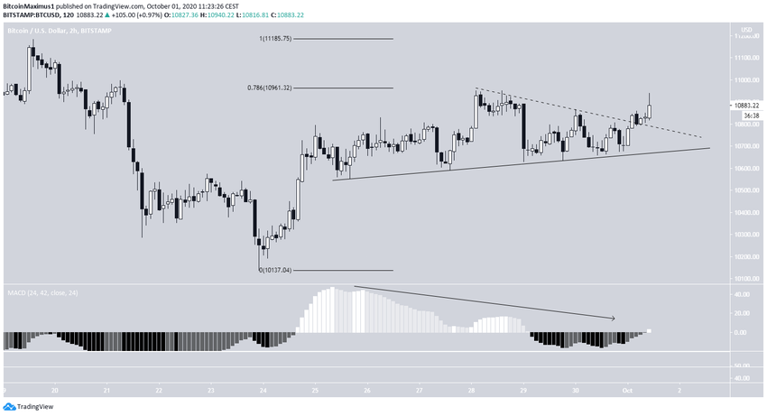 На 2-часовых графиках видно, что цена следует за линией восходящей поддержки и, возможно, уже пробила симметричный треугольник (пунктирная линия на графике). Это повышает вероятность повторного тестирования зоны $11 200.