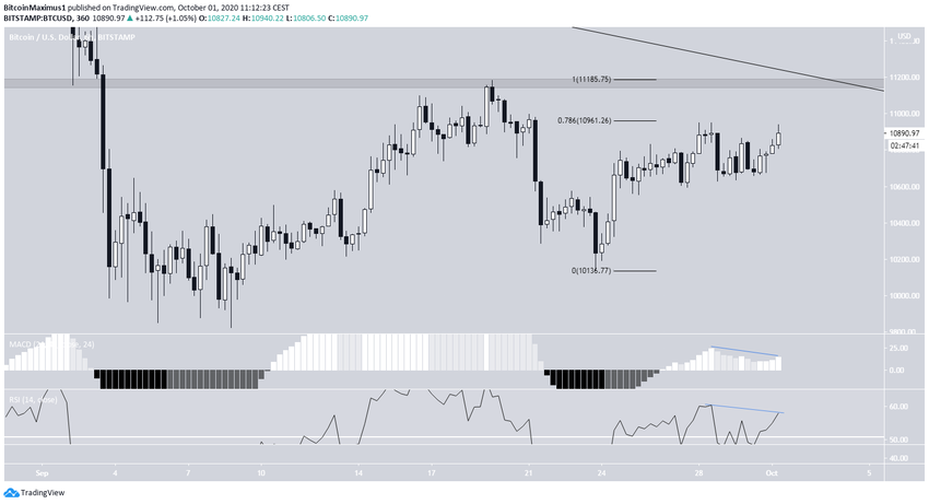 Котировки уверенно росли до тех пор, пока не натолкнулись на отметку $10 959, где расположен уровень 0,786% коррекции Фибоначчи относительно предыдущего снижения. Однако откат оказался вялым, и к настоящему моменту биткоин уже предпринимает новую попытку восходящего прорыва.