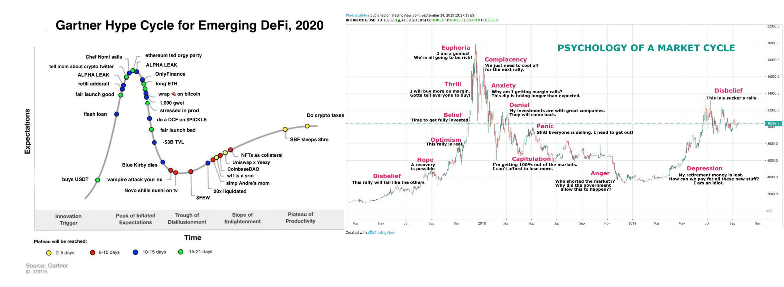 Тем временем участники криптосообщества обратили внимание на то, что циклы развития многих DeFi-проектов очень похожи. Путь большинства токенов состоит из резкого взлета, после которого наступает период фиксации прибыли, с медленным обратным переходом в позитивное движение. Представленная участниками криптосообщества кривая поведения DeFi-монет похожа на график, который отражает психологию рыночных циклов.