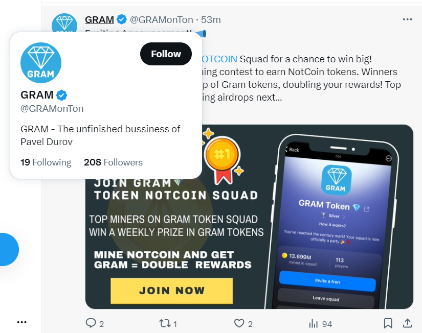 Sponsored SponsoredВ сети есть информация и о других токенах GRAM. Например, по поисковому запросу $GRAM в Х (бывший «Твиттер») можно наткнуться на страницы, авторы которых якобы продолжают разработку незавершенного криптопроекта Телеграм. У многих есть свои токены Грамм.