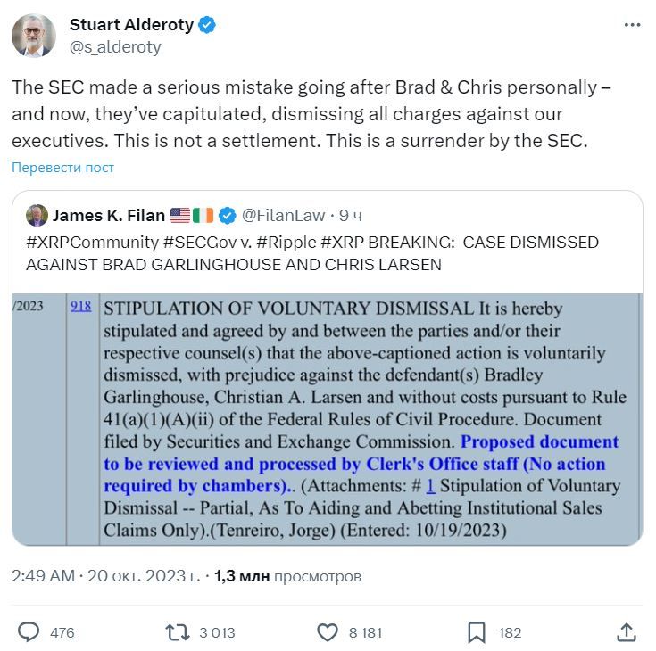 Вечером 19 октября 2023 года в сети появилась новость о том, что SEC отказалась от иска против калифорнийского криптопроекта Ripple. С руководства компании сняли все обвинения. Напомним, SEC обвиняла генерального директора Ripple Брэда Гарлингхауса и исполнительного председателя компании Криса Ларсена в нарушении закона о ценных бумагах.