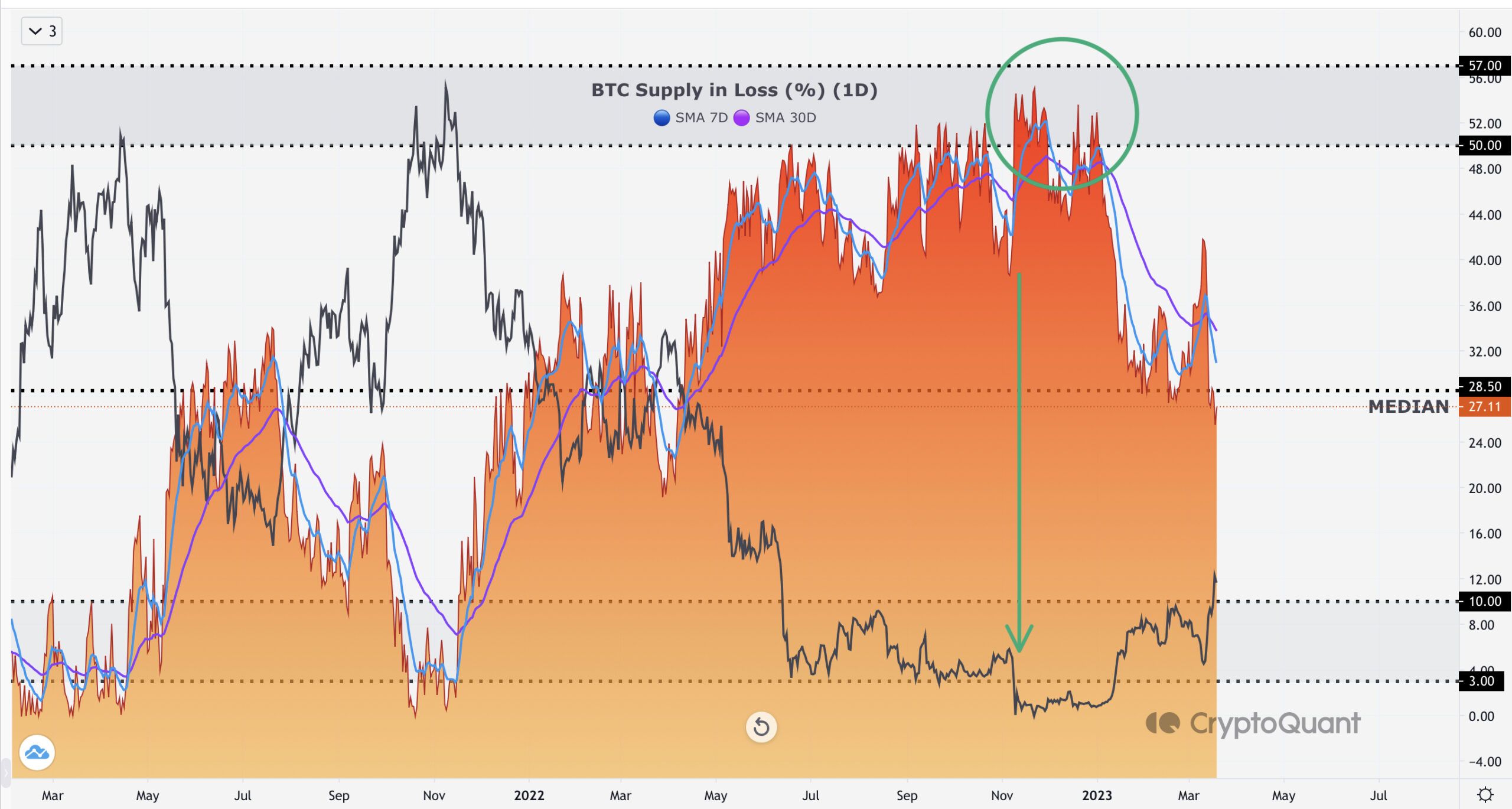 Давайте более подробно рассмотрим ситуацию на криптовалютном рынке, связанную с крахом криптобиржи FTX, который произошел в ноябре прошлого года. На графике мы можем наблюдать резкое падение биткоина, которое произошло после начала паники среди инвесторов. Движение было вызвано массовыми продажами BTC, которые привели к колоссальным потерям на рынке. В тот день более 50% всех инвесторов потерпели убытки. Для примера, проблемы рынка, связанные с COVID-19 в марте 2020 года, привели к потерям рынка на уровне 57%.