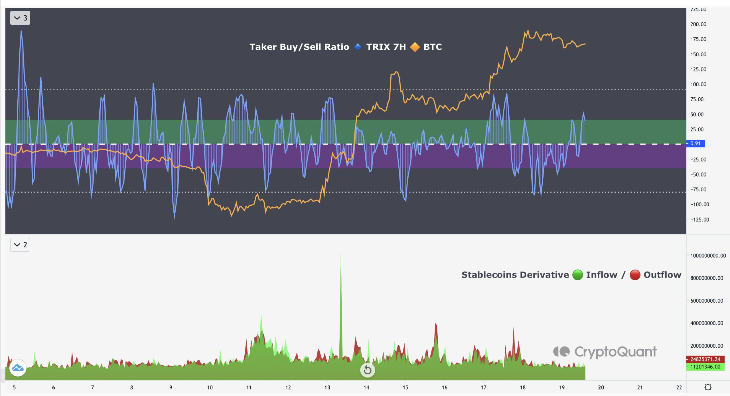 Ниже на этом графике — Stable Coins Derivative Inflow/Outflow. Если мы видим большое значение Inflow, это означает, что объем поступлений стейблкоинов на бирже превышает их вывод. Метрика может свидетельствовать о том, что инвесторы готовятся к активным действиям на рынке, таким как покупка биткоина. В таких случаях, увеличение притока стейблкоинов на биржи может предвещать рост спроса на BTC и, как следствие, повышение его цены. Этот индикатор усиливает сигналы от BTC Taker Buy/Sell Ratio.