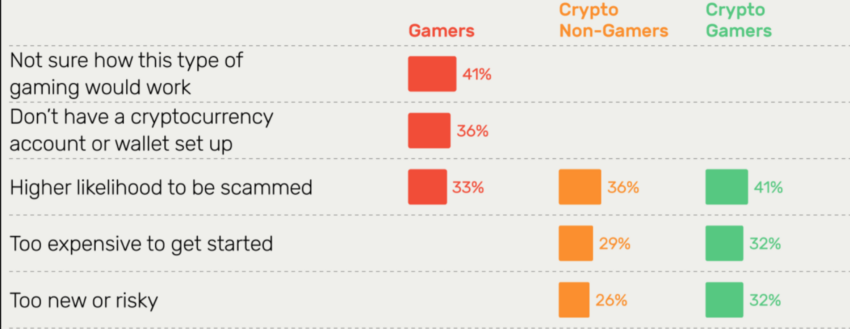 Coda labs пролили свет на этот аспект, задав вопросы об играх на блокчейне 6921 человеку из пяти стран. В результате оказалось, что только 12% геймеров пробовали играть в Web3-игры, и только 15% из оставшихся опрошенных были заинтересованы в том, чтобы сделать это в будущем.