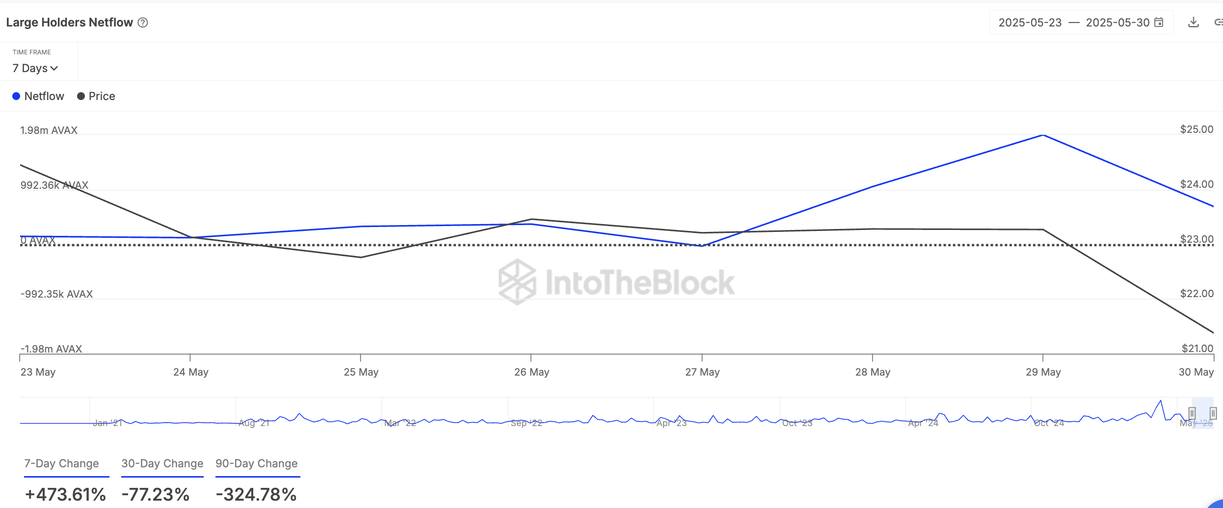 Рост чистого потока крупных держателей указывает на то, что больше токенов поступает в их кошельки, чем выходит. Это свидетельствует о том, что киты AVAX накапливают актив, что говорит о доверии к его будущей стоимости.