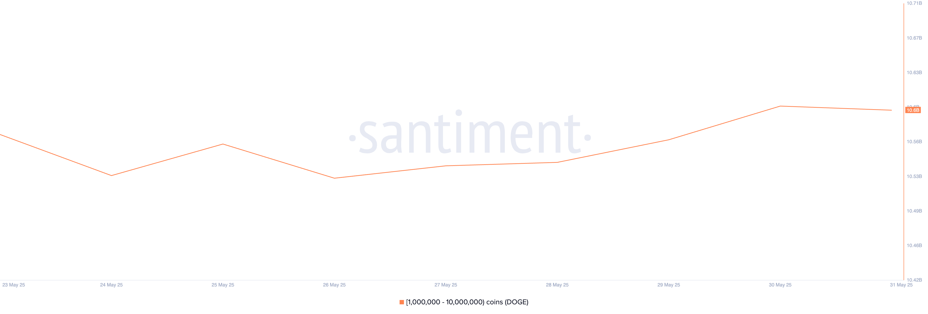 Ведущий мемкоин, DOGE, входит в число активов, которые киты накапливают для возможной прибыли в июне. Это подтверждается недавним увеличением накопления DOGE среди китов, владеющих от 1 млн до 10 млн токенов. По данным Santiment, за последнюю неделю они закупили еще 30 млн токенов.