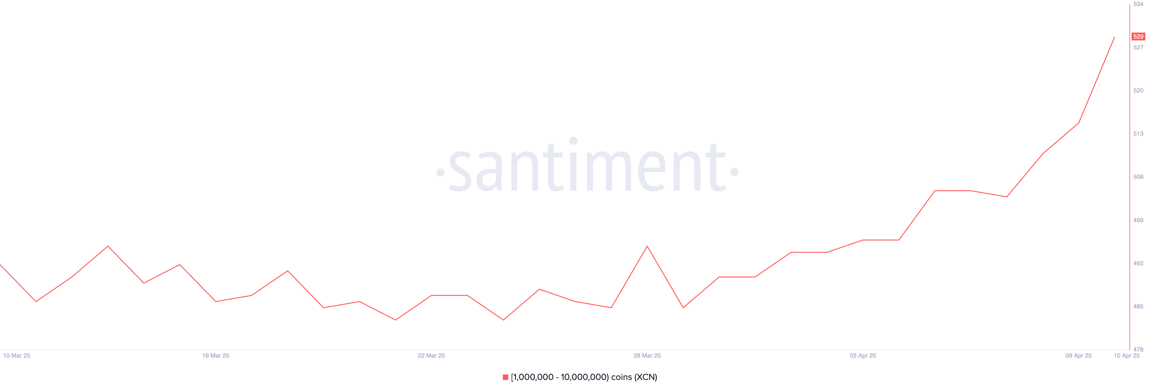 С седьмого по десятое апреля количество адресов с балансом от 1 млн до 10 млн XCN выросло с 503 до 532. Это свидетельствует о повышенном интересе к активу со стороны крупных инвесторов.