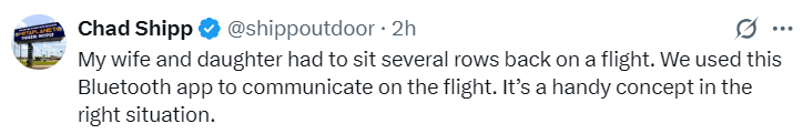 «Мои жена и дочка сидели на задних рядах самолета. Мы использовали это приложения для общения во время перелета. Это очень удобное решение в определенных ситуациях», — так один из первых пользователей описал свой опыт с BitChat.