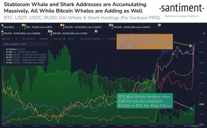 На фоне затяжного бокового движения кошельки с балансом 100-10 000 BTC продолжают скупать биткоин. Также участники рынка накапливают стейблкоины, которые могут стать «топливом» для следующей фазы роста биткоина.