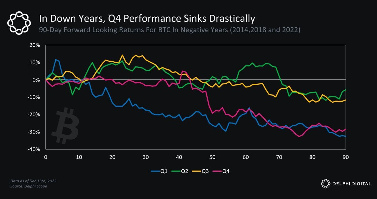 Команда VanEck, в свою очередь, дала негативный прогноз биткоина. Аналитики не исключают падение биткоина к $10-12 тыс. в новом году. Негативный прогноз биткоина поддерживает статистика. В разрезе истории поведения BTC, худшими периодами для медвежьих рынков являются 1 и 4 кварталы года.