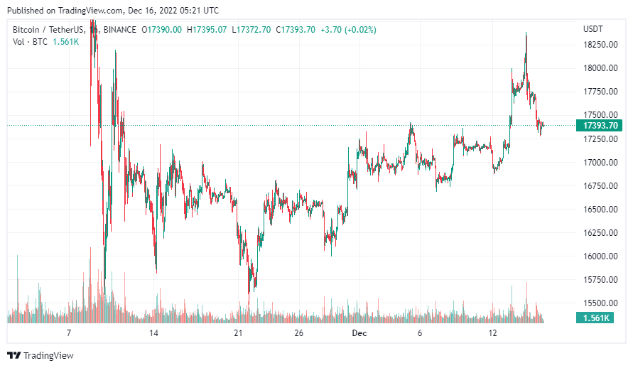 Биткоин начал неделю с роста. Штаты опубликовали хорошую статистику по инфляции в США 13 декабря, а Федрезерв замедлил темпы повышения ставки, что помогло биткоину обновить максимум за 30 дней. По данным данным CoinMarketCap, 14 декабря BTC достиг отметки $18 318. На момент публикации биткоин скорректировался до $17,3 тыс.